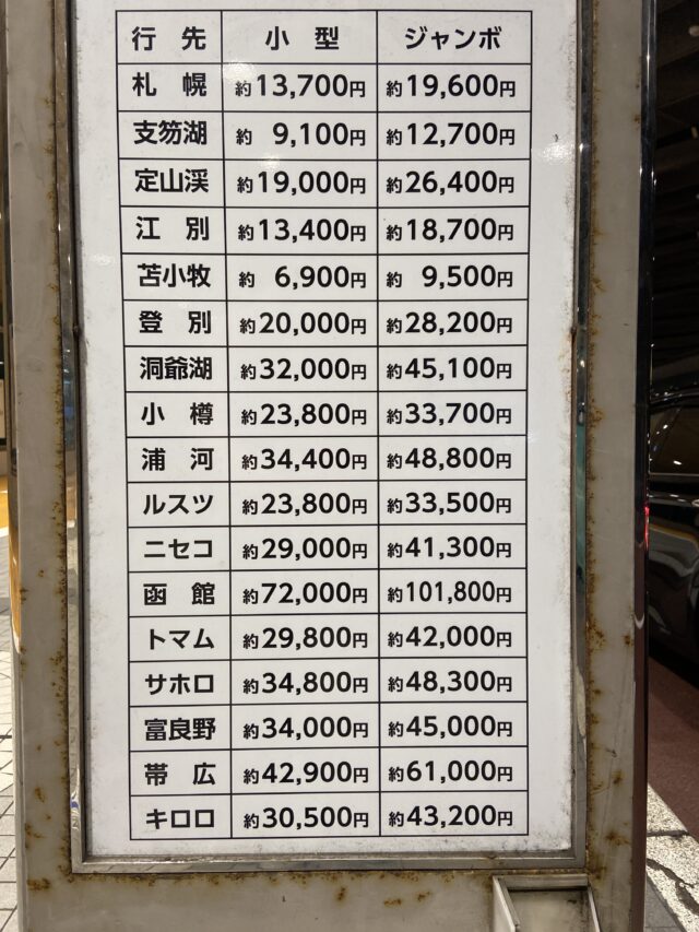 また、空港送迎タクシー(定額タクシー)を使うと、高速料金・待ち時間込みの値段で札幌駅まで連れて行ってくれるので少しお得です。